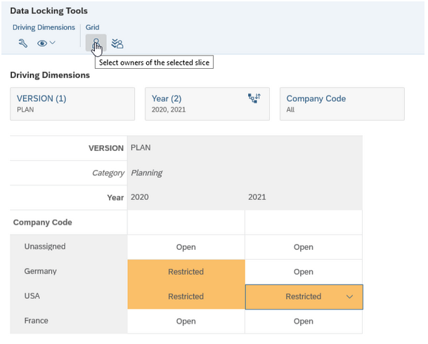 Data locks are also possible across multiple dimensions. This enables you to implement more complex scenarios. Note that only those users who are maintained as owners in both dimensions are considered to be the owners of the combination.