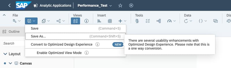 In a story with "Optimized Design Experience", the new menu layout is immediately noticeable. The story design view now has an outline and looks more like an application than a classic SAC story. But the changes are not only visual, because basically all functions of the Applications have been implemented. All widgets and objects can now be used in the story. Also on board is the complete and partially extended scripting API, as well as the ability to customize the design using CSS.