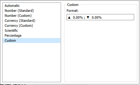 Anschließend können die nötigen Formatierungen vorgenommen werden. Im Formatierungs-Bereich kann z.B. ein benutzerdefiniertes Zahlenformat hinterlegt werden, um dem Prozentwert mit einem Änderungs-Indikator zu versehen.
