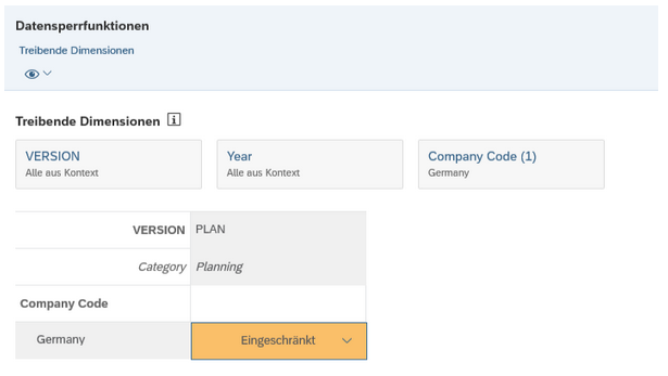 Datensperren können in den Einstellungen des jeweiligen Modells konfiguriert werden. Unter dem Punkt Treibende Dimensionen können Sie die Dimensionen hinzufügen, um somit die Granularität der Datensperren zu bestimmen. Wenn Sie zum Beispiel die Daten pro Buchungskreis sperren möchten, fügen Sie die Dimension für den Buchungskreis hinzu. Version und Datum sind automatisch als treibende Dimensionen ausgewählt.